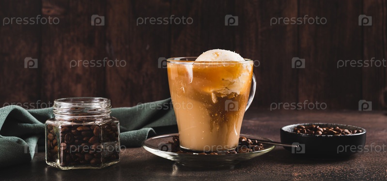Вкусный сладкий кофе аффогато со сливочным мороженым в чашке на столе веб-баннер