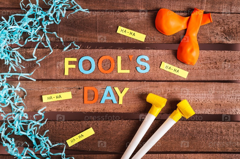 День смеха из цветных букв, забавных записок, свистков и воздушных шаров на деревянном фоне