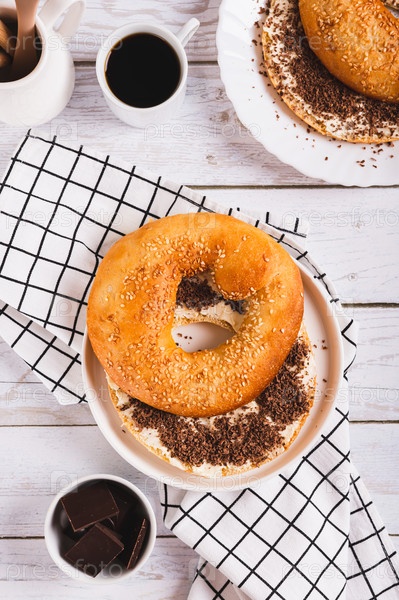 Сладкий сэндвич с маслом, шоколадом и кунжутом на тарелке на столешнице и вертикальный вид