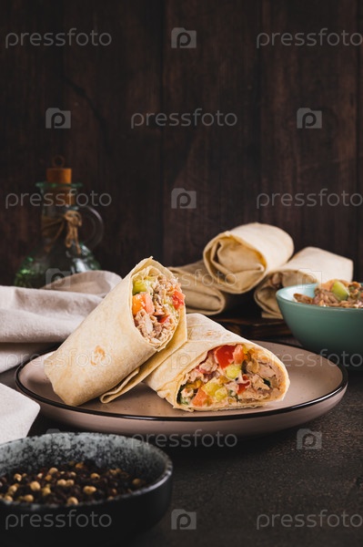 Домашняя шаурма с курицей, помидорами и огурцами в пите вертикальный вид