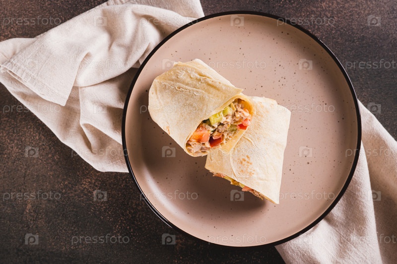 Крупный план домашней шаурмы с курицей, помидорами и огурцами в пите, вид сверху