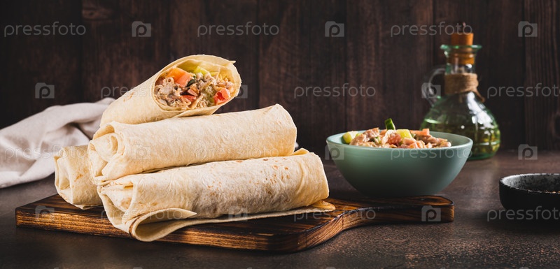 Домашняя шаурма с курицей, помидорами и огурцами в пите веб-баннер