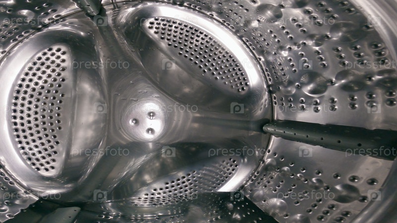 Крупный план внутренней части барабана стиральной машины, показывающий перфорированную металлическую поверхность и центральный перемешиватель с тремя рычагами. Барабан изготовлен из нержавеющей стали и имеет отражающую поверхность