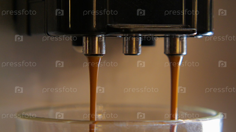 Крупный план кофемашины с двумя носиками, наливающей эспрессо в прозрачную стеклянную чашку. Темно-коричневый эспрессо льется в чашку