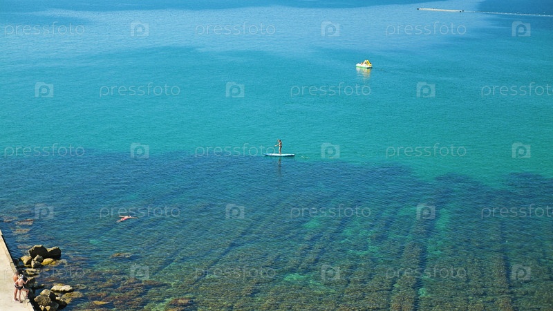 Панорамный вид на живописное побережье с прозрачной бирюзовой водой. Люди наслаждаются различными водными видами спорта, включая паддлбординг и плавание