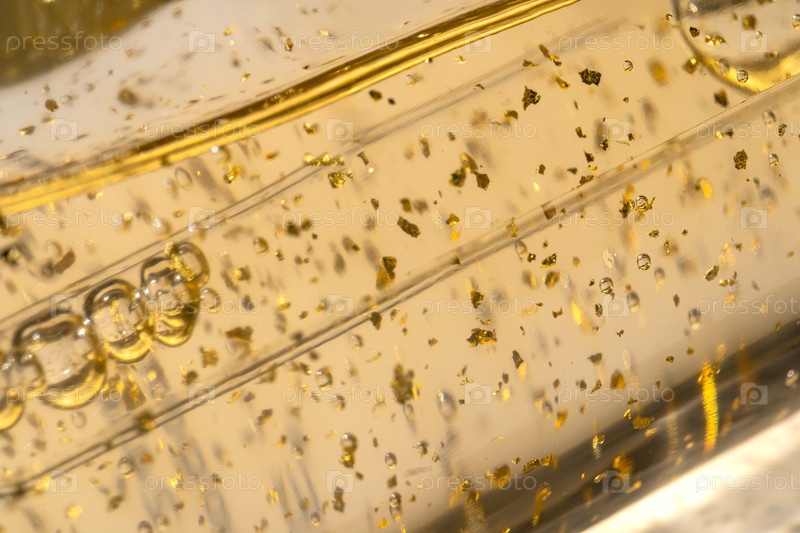 24-каратное золотое средство по уходу за кожей в стеклянной бутылке крупным планом. Макрос текстуры продукта для косметического ухода
