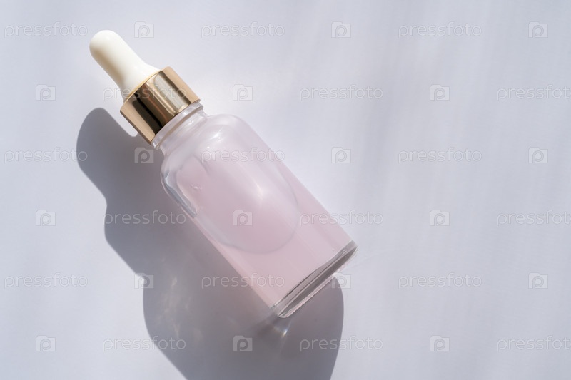 Макет стеклянной бутылки-капельницы. Пипетка-капельница с сывороткой или эфирным маслом на белом фоне с едкими тенями для презентации продукта. Косметика для ухода за кожей. Концепция красоты для ухода за лицом и телом
