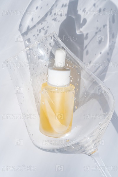 Косметический флакон-капельница с желтой сывороткой в бокале для вина на белом фоне крупным планом. Эстетическая концепция