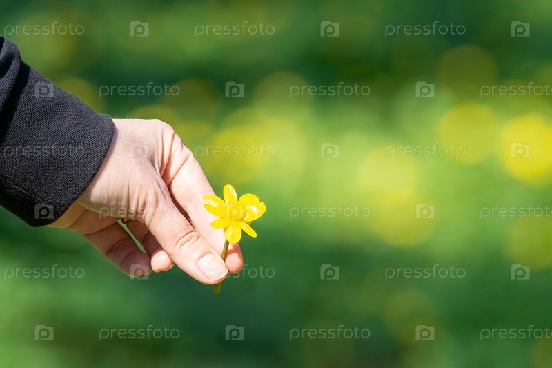 Лютик в руке, зеленый фон