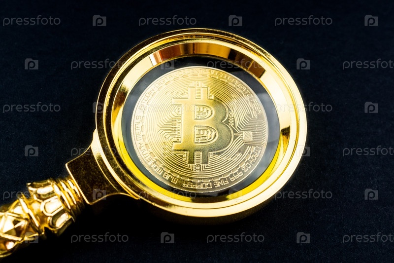 Биткоин и лупа на черном фоне