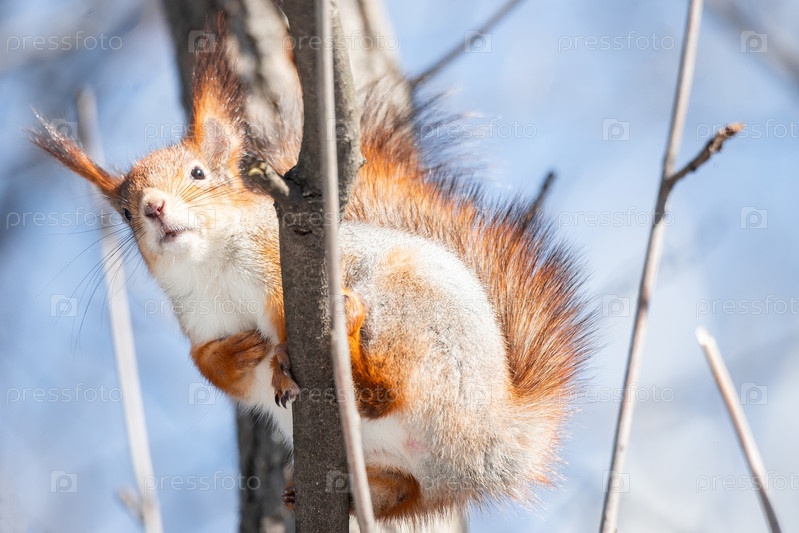 Белка зимой сидит на дереве