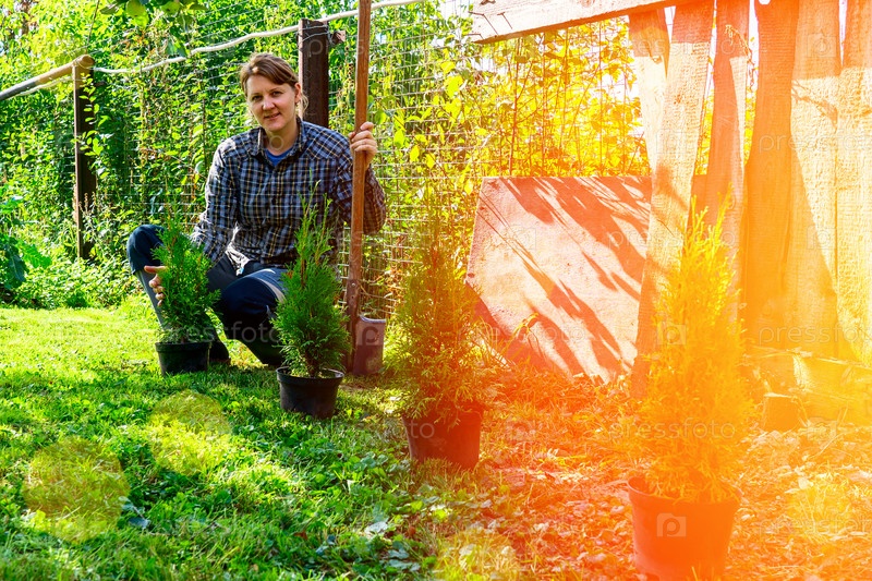 Подготовка и посадка туи в саду, озеленение заднего двора, тонированное изображение, селективный фокус, живая изгородь,