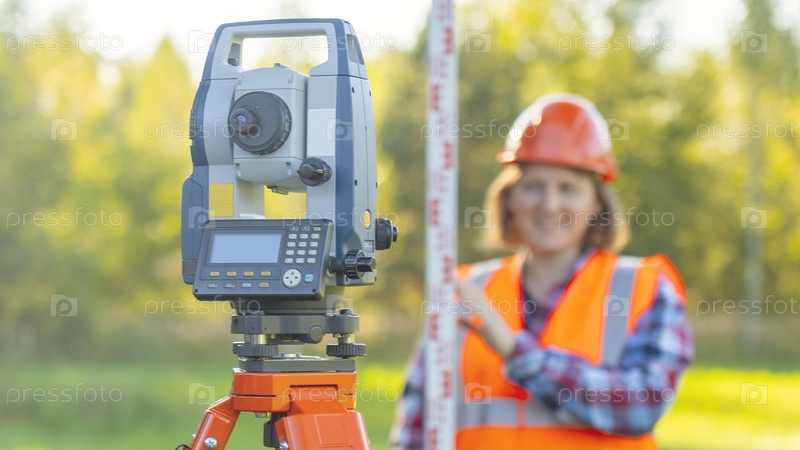Женщина в оранжевом жилете стоит рядом с прибором, измеряющим углы