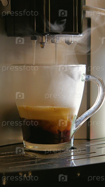Крупный план кофемашины, наливающей капучино в прозрачную стеклянную чашку. Кофе переслаивается эспрессо, молочной пеной и слоем пропаренного молока. Пар поднимается из чашки и машины