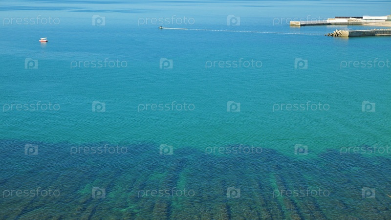 Панорамный вид на живописное побережье с прозрачными бирюзовыми водами. Вдалеке видна небольшая лодка, а бетонный пирс уходит в море. Вода спокойная и прозрачная, обнажая морское дно