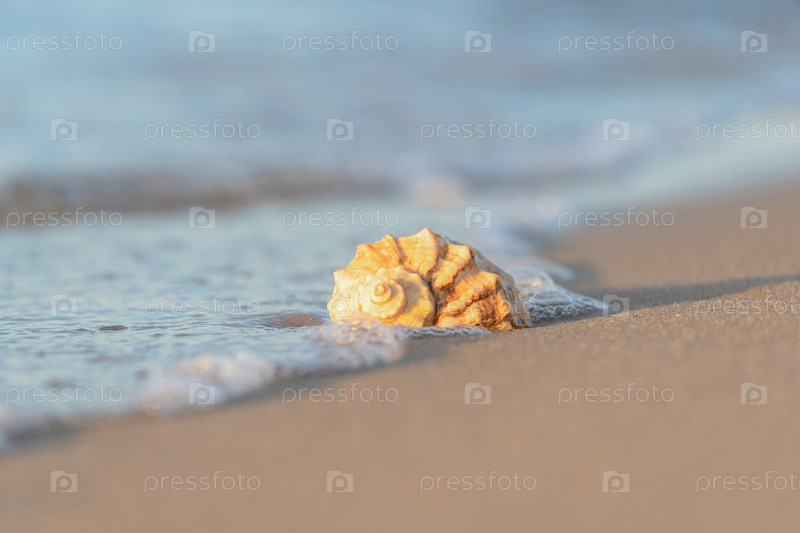 Красивая ракушка лежит на пляже, рядом с лазурной водой моря