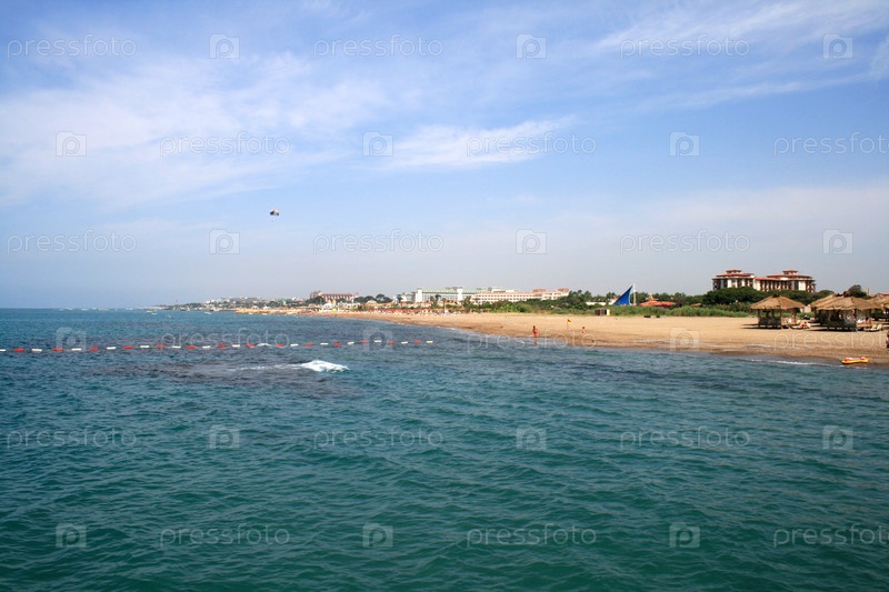 Песчаный пляж с синим морем и курортными отелями на заднем плане