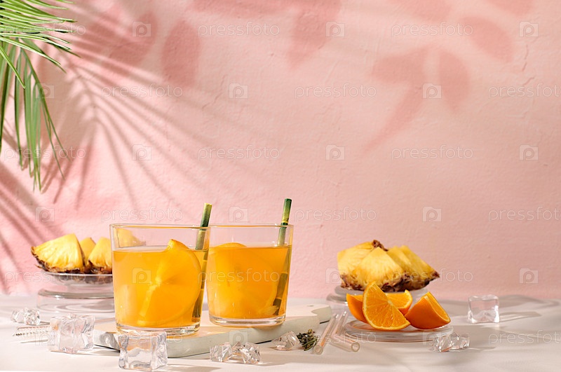 Коктейль с текилой, ромом и водкой с кусочками ананаса, апельсином, льдом и розмарином. Концепция летней вечеринки. Диетический напиток для детоксикации организма и снижения веса, реклама бара или кафе, меню ресторана