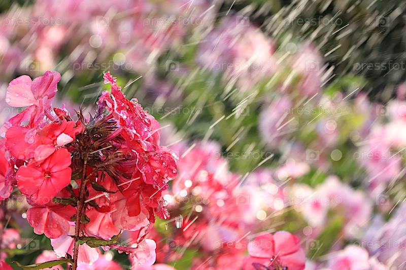 Абстрактный цветочный весенний расфокусированный фон в пастельных тонах с мягким фокусом и боке. Экранный баннер с цветами флокса под дождем, красивая яркая поздравительная открытка или приглашение