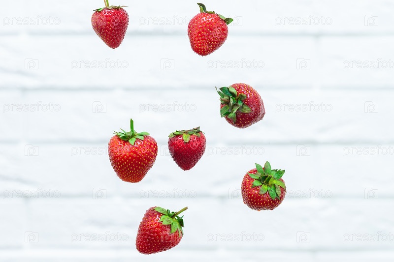 Ягода клубники, парящая в воздухе на белом фоне