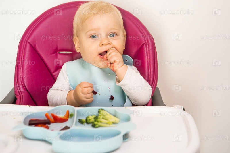 Детское питание. Первый прием пищи. Кормление ребенка. Милый маленький ребенок ест овощи. Здоровая еда. Ребенок сидит на высоком стульчике для кормления. Свежие овощи и фрукты