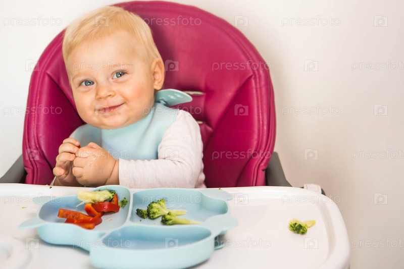 Детское питание. Первый прием пищи. Кормление ребенка. Милый маленький ребенок ест овощи. Здоровая еда. Ребенок сидит на высоком стульчике для кормления. Свежие овощи и фрукты