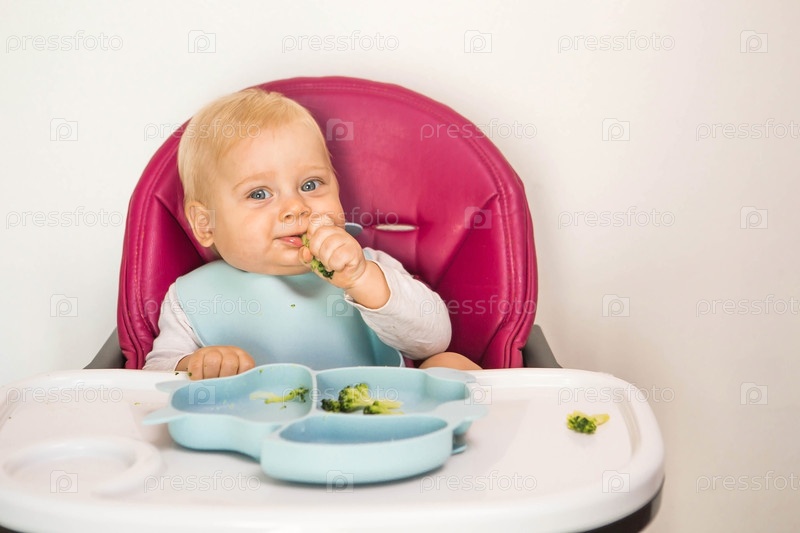 Детское питание. Первый прием пищи. Кормление ребенка. Милый маленький ребенок ест овощи. Здоровая еда. Ребенок сидит на высоком стульчике для кормления. Свежие овощи и фрукты