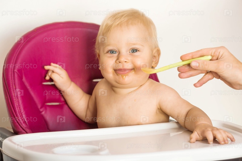 Детское питание. Первый прием пищи. Кормление ребенка. Милый маленький ребенок ест овощи. Здоровая еда. Ребенок сидит на высоком стульчике для кормления. Свежие овощи и фрукты