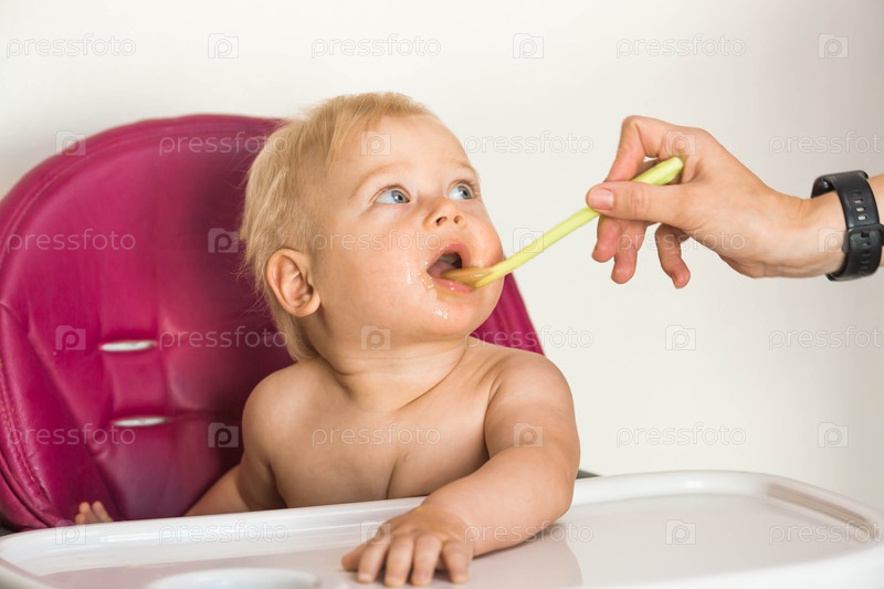 Детское питание. Первый прием пищи. Кормление ребенка. Милый маленький ребенок ест овощи. Здоровая еда. Ребенок сидит на высоком стульчике для кормления. Свежие овощи и фрукты