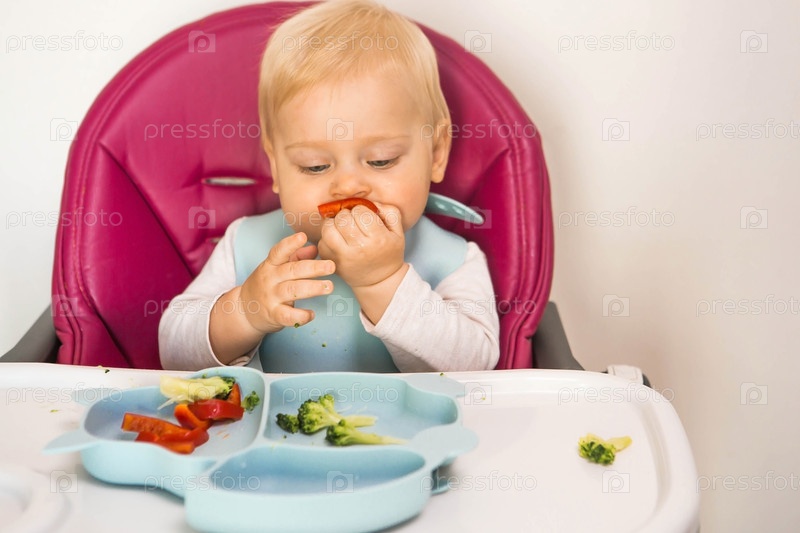 Детское питание. Первый прием пищи. Кормление ребенка. Милый маленький ребенок ест овощи. Здоровая еда. Ребенок сидит на высоком стульчике для кормления. Свежие овощи и фрукты