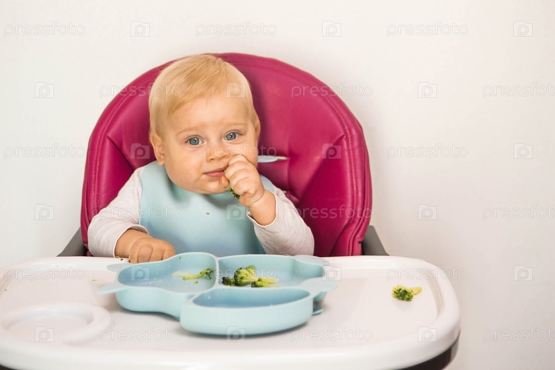 Детское питание. Первый прием пищи. Кормление ребенка. Милый маленький ребенок ест овощи. Здоровая еда. Ребенок сидит на высоком стульчике для кормления. Свежие овощи и фрукты