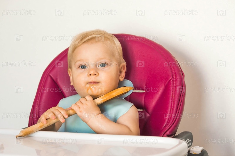 Детское питание. Первый прием пищи. Кормление ребенка. Милый маленький ребенок ест овощи. Здоровая еда. Ребенок сидит на высоком стульчике для кормления. Свежие овощи и фрукты