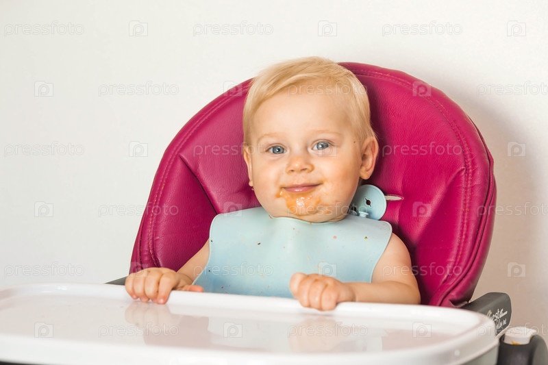Детское питание. Первый прием пищи. Кормление ребенка. Милый маленький ребенок ест овощи. Здоровая еда. Ребенок сидит на высоком стульчике для кормления. Свежие овощи и фрукты