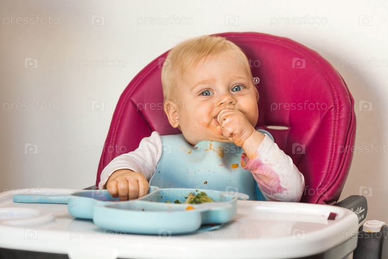 Детское питание. Первый прием пищи. Кормление ребенка. Милый маленький ребенок ест овощи. Здоровая еда. Ребенок сидит на высоком стульчике для кормления. Свежие овощи и фрукты