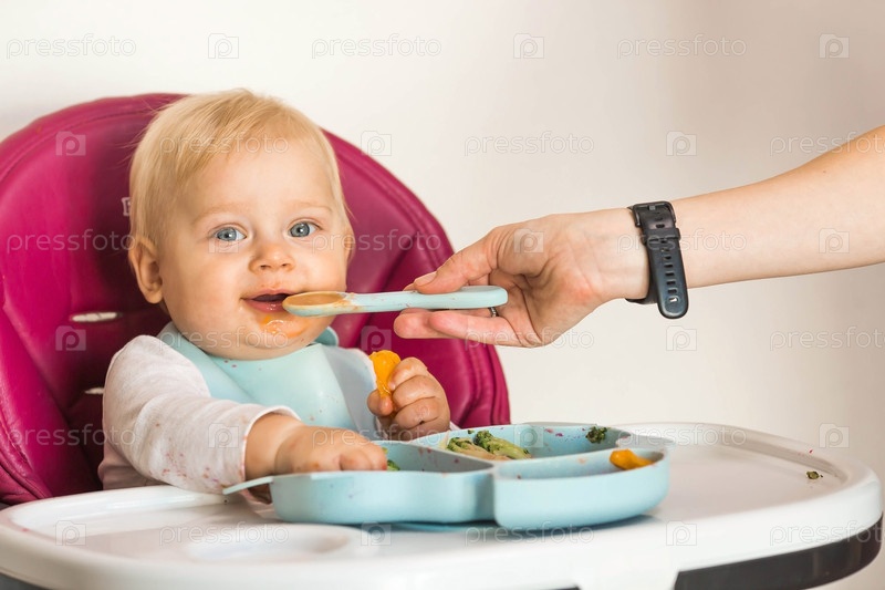 Детское питание. Первый прием пищи. Кормление ребенка. Милый маленький ребенок ест овощи. Здоровая еда. Ребенок сидит на высоком стульчике для кормления. Свежие овощи и фрукты
