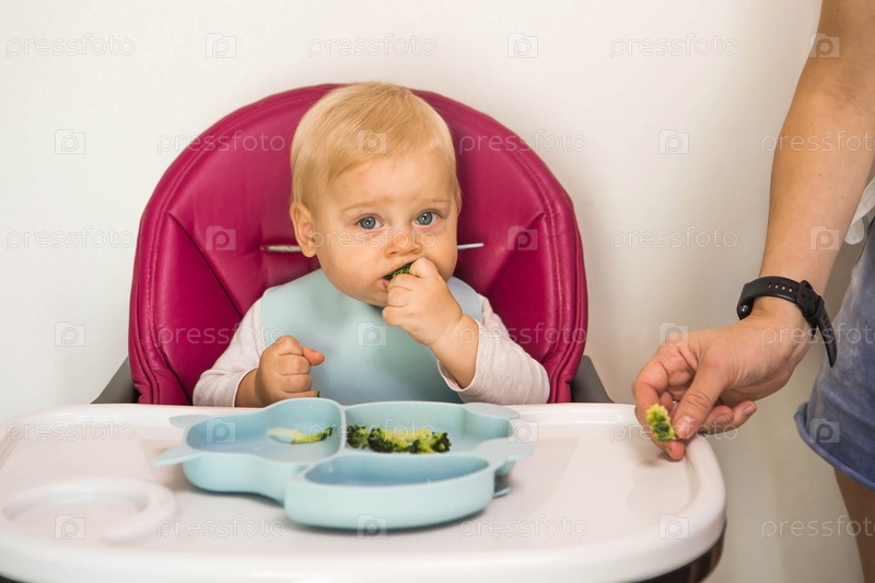 Детское питание. Первый прием пищи. Кормление ребенка. Милый маленький ребенок ест овощи. Здоровая еда. Ребенок сидит на высоком стульчике для кормления. Свежие овощи и фрукты