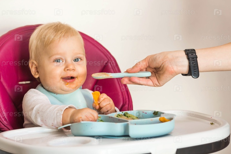 Детское питание. Первый прием пищи. Кормление ребенка. Милый маленький ребенок ест овощи. Здоровая еда. Ребенок сидит на высоком стульчике для кормления. Свежие овощи и фрукты