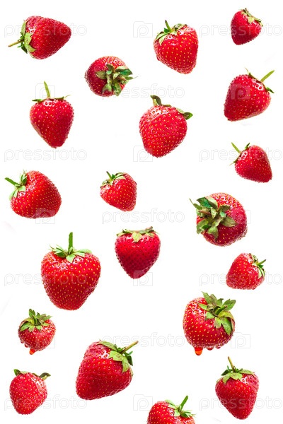 Ягода клубники, парящая в воздухе на белом фоне