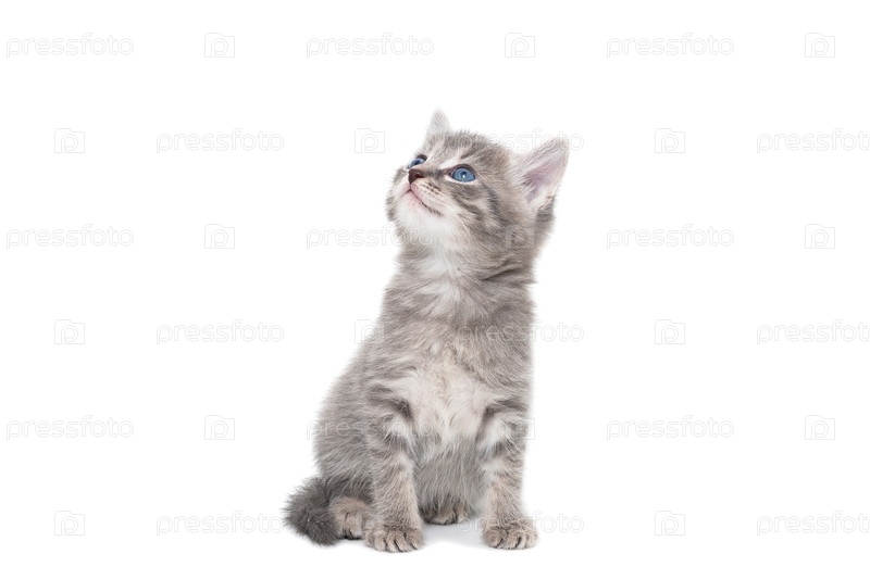 Полосатый чистокровный котенок сидит на белом фоне