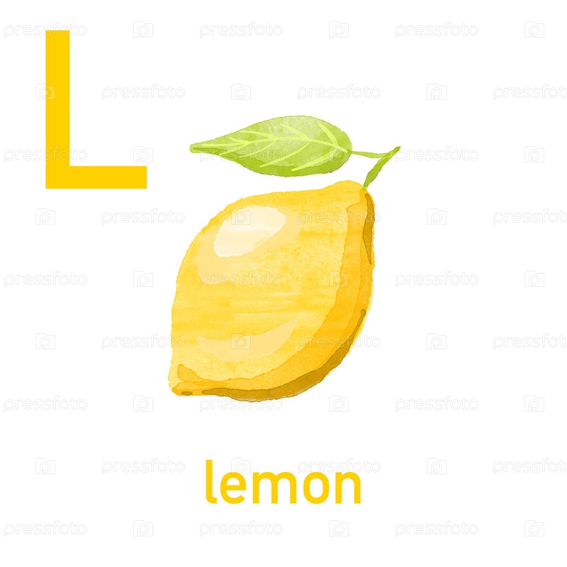Акварельный английский алфавит из милых фруктов и овощей. Акварельная иллюстрация еды. Вегетарианский алфавит. Назад в школу. Лимон