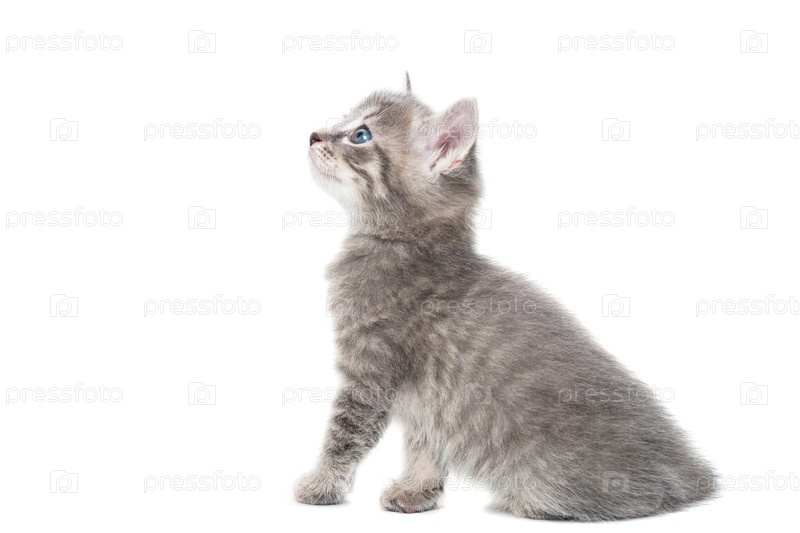 Полосатый чистокровный котенок сидит на белом фоне