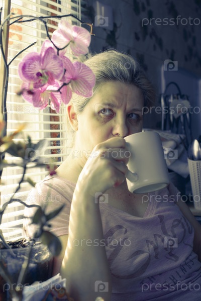 Женщина пьет кофе из белой кружки