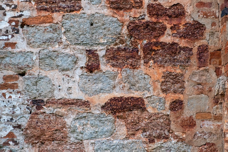Крупный план фрагмента исторической каменной стены, демонстрирующий различные текстуры и цвета