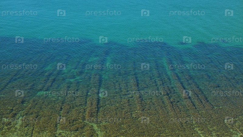 Подводное дно с морской травой. Крупный план мелководного морского дна с густым ростом морской травы. Вода прозрачная и бирюзовая, что позволяет ясно видеть подводный ландшафт