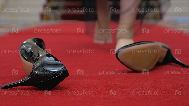 Пара черных туфель на высоком каблуке лежит на красной дорожке, на заднем плане босые ноги. Один каблук лежит на боку, а другой стоит вертикально. Ноги устали от обуви