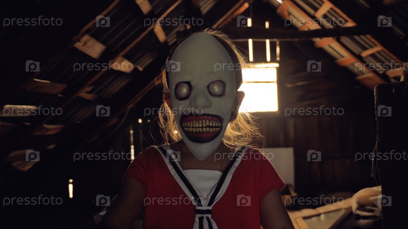 Девочка в жуткой маске стоит на тускло освещенном чердаке с деревянными балками и окном на заднем плане. Ребенок — монстр