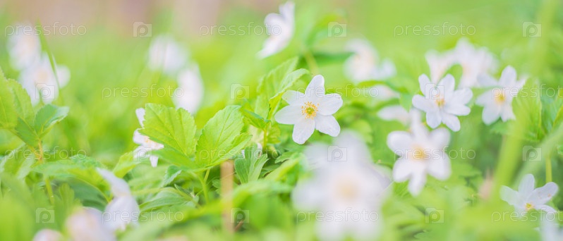 Белые цветы среди зелени, мягкий фокус, размытый фон. Ветреничка дубравная