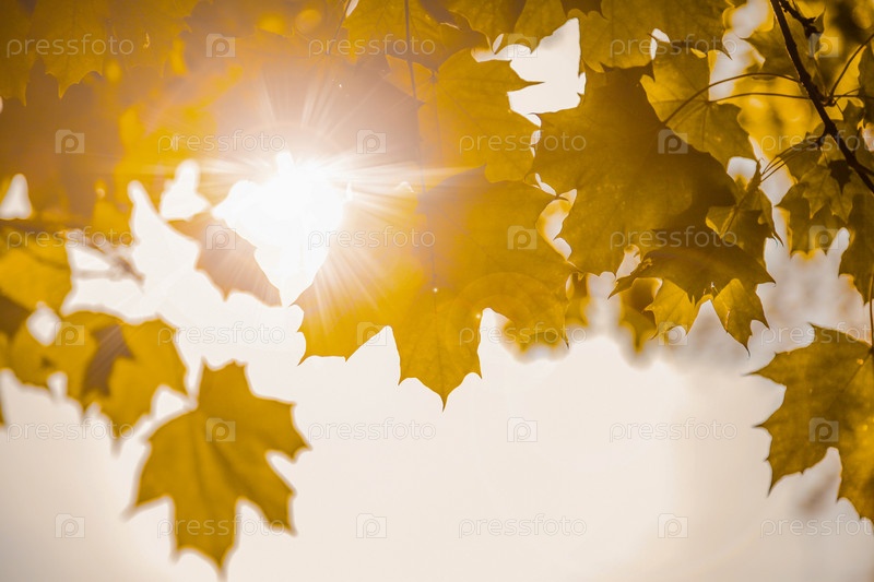 Осеннее солнце светит сквозь желтые листья тонированные