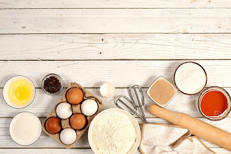 Рецепт с яйцами, мукой, сахаром, медом, корицей, дрожжами и маслом. Кухонный фон приготовления. Кулинарные ингредиенты для приготовления пирога и хлеба, Современная концепция пекарни