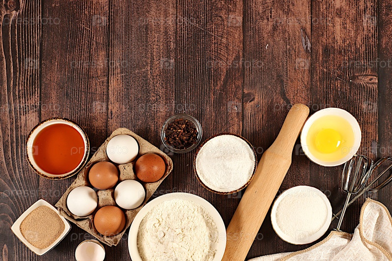 Фон кухни приготовления пищи с пространством для текста. Кулинарные ингредиенты для приготовления пирога и хлеба, рецепт с яйцами, мукой, сахаром, медом, корицей, дрожжами и маслом. Современная концепция пекарни,